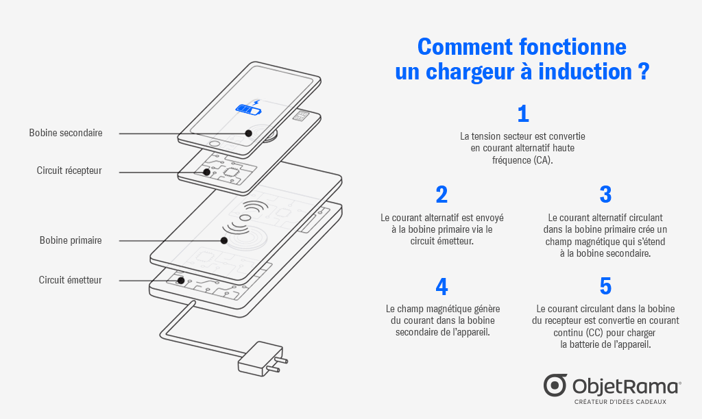 Contrairement au chargement standard d’un téléphone, l'énergie est transmise par un champ électromagnétique produit par la circulation d'un courant électrique entre 2 bobines de cuivre situées à proximité.