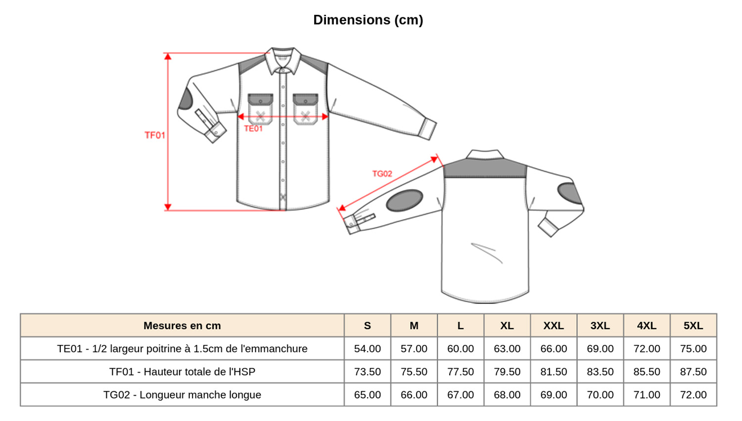 Cette chemise est confectionnée en 100 % coton avec un tissu sergé, offrant une bonne tenue et un confort agréable au porté. Sa coupe standard assure une silhouette droite et facile à porter, adaptée à un usage quotidien en atelier, en magasin ou lors de déplacements professionnels.