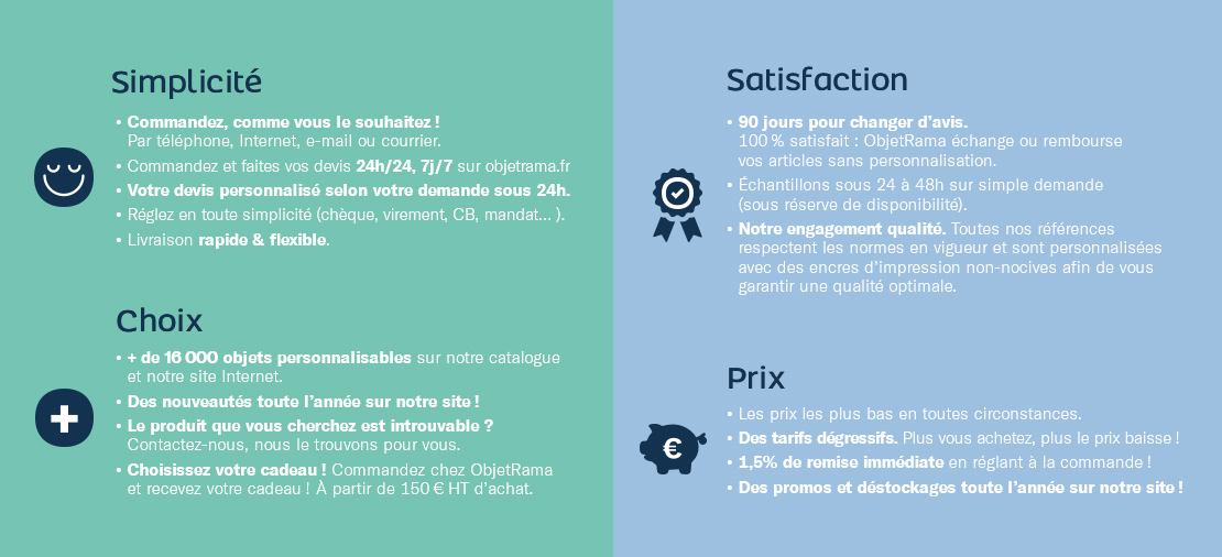 C’est avant tout l’Humain qui est au cœur de la culture d’ObjetRama. Les projets de nos clients sont uniques et leur accompagnement se doit de l’être tout autant. Pour le garantir, ce sont plus de 130 collaborateurs qui œuvrent en toute transparence pour vous accompagner et pour faire de votre commande une expérience marquante et satisfaisante.